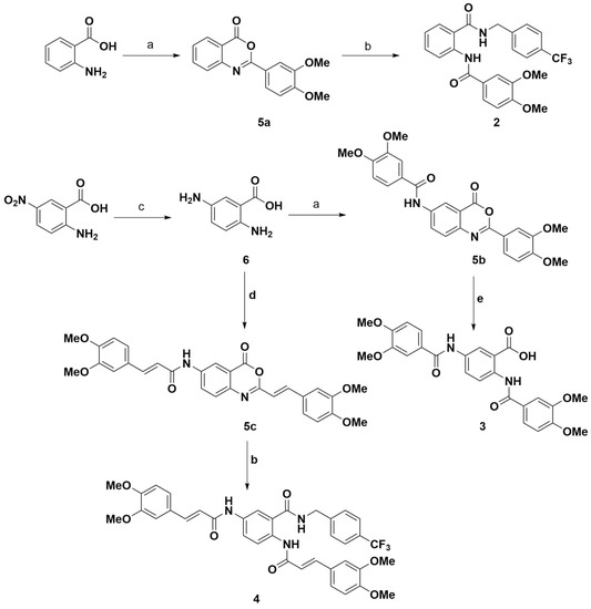 Compound 2 was prepared from 4H-3,1-benzoxazin-4-one derivative 5a, obtained from the reaction of anthranilic acid with 3,4-dimethoxybenzoic acid chloride (94% yield) and the subsequent opening of 5a by treatment with 4-trifluoromethylbenzylamine to obtain compound 2 with a yield of 71%. A similar procedure was carried out to obtain compound 4 from compound 5c, although slightly lower yields were obtained (71% for 5c and 61% for 4). The preparation of compound 3 was initially attempted from the treatment of 5-aminoanthranilic acid with two equivalents of 3,4-dimethoxybenzoic acid chloride, obtaining the targeted disubstituted compound with a small quantity of the mono-substituted derivative. Therefore, we decided to prepare 3 from compound 5b (91% yield) and subsequent treatment with 5% sodium hydroxide solution to open the benzoxazinone ring, a strategy that gave better results in terms of yield (85%) and reaction workup.