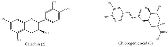 Chlorogenic acid and catechin are natural polyphenolic compounds. Natural phenolics have been linked to a variety of biological activities, including antimicrobial activity [23]. Polyphenolics affect the cell-wall proteins and the synthesis of nucleic acid [24]; however, other research implies that chlorogenic acid affects bacterial cell membranes, causing rupture of the membrane, which then allows macromolecules to leak into the cytoplasm and, ultimately, results in bacterial mortality [25,26]; moreover, in silico study revealed that phenolic compounds cause efflux pump inhibition [27].