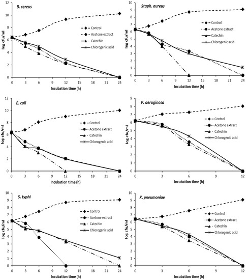 Time-kill curve assays were achieved using the identified synergistic combinations of acetone extract, catechin, and chlorogenic acid with tetracycline against tested bacteria. The overnight growth plate was inoculated in sterile T.S.B. to achieve the approximate density of 0.5 McFarland standard. The suspension was diluted 1:10 in T.S.B. to obtain a standard inoculum of 1 × 106 CFU/mL. One hundred μL of the diluted suspension was added to 0.9 mL of T.S.B. Double dilutions for each acetone extract, catechin, and chlorogenic acid in combination with tetracycline were prepared. Tubes containing the combinations were incubated at 35 °C for 24 h. From each tube, 100 μL of the sample was collected at 0, 4, 8, and 24 h, respectively, and inoculated to plate count media to determine the count of viable cells. Sterility control and growth control were included in each assay. The killing rate was determined by plotting viable colony counts (CFU/mL) against time. Synergy was defined as a ≥2 log10 CFU/mL decrease of viable count by the combination compared with the most active single agent.