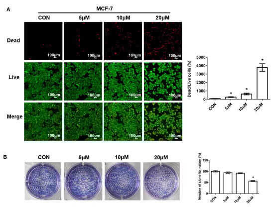 Compound 5d suppressed cell proliferation. (A) MCF-7 cells were treated with 5 μM, 10 μM, 20 μM of compound 5d for 24 h, then, cells were stained with live/dead dyes. Left: fluorescence confocal images; right: ratio of dead to live cells. (B) MCF-7 cells were treated with 5 μM, 10 μM, 20 μM of compound 5d for 48 h, then, cells were cultured continuously until single cell clone appeared, followed by staining with Giemsa dye. Left: photographs of cells; right: statistical graph. Data were presented as means ± SEM, * p < 0.05.