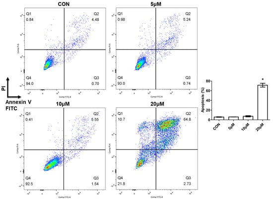 Annexin V-FITC/PI apoptosis detection was performed according to the manufacturer’s instruction. Cells were cultured in a 6-well plate and treated with different concentrations of compounds (0, 5 μM, 10 μM, 20 μM) for 48 h. Then, cells were collected and washed with PBS and suspended in Annexin V binding buffer. FITC labeled Annexin V and PI were added and incubated for 20 min in the dark. Samples were measured using flow cytometry as soon as possible and the raw data was analyzed using FlowJo software (v10, Becton, Dickinson and Company, Ashland, CA, USA).
