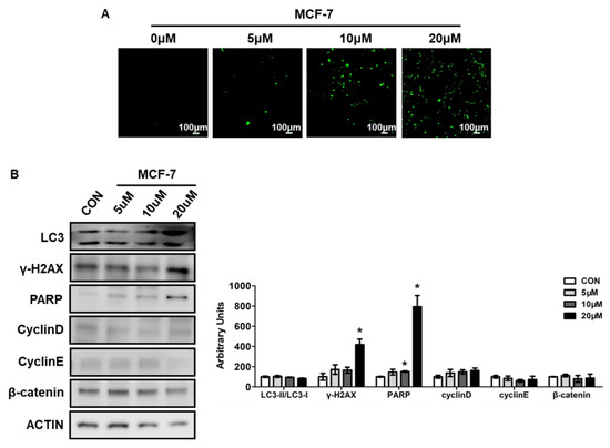 Compound 5d increased ROS levels and induced DNA damage. (A) MCF-7 cells were treated with 5 μM, 10 μM, 20 μM of compound 5d for 24 h, then cells were stained by DCFH-DA for 30 min, ROS were detected using fluorescent confocal microscope. (B) MCF-7 cells were treated with 5 μM, 10 μM, 20 μM of compound 5d for 48 h, cell protein were collected and analyzed by Western boltting. Left: western bolt of LC3, γ-H2AX, PARP, Cyclin D, Cyclin E, β-catenin; right: quantitative measurements relative to ACTIN. Data were presented as means ± SEM, * p < 0.05.