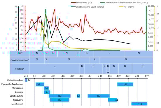 The temperature, cerebrospinal fluid nucleated cell count, blood leukocyte count, PCT, culture results of specimens sent, and the use of antimicrobials during hospitalization. Description: PCT: procalcitonin; CSF: cerebrospinal fluid; K: carbapenem-resistant Klebsiella pneumoniae; A: carbapenem-resistant Acinetobacter baumannii; N: unknown term; -: negative. d-1: day-1; 10 February 2022, is day 0. *: The time corresponding to the table is the time the specimen was sent for testing, and the culture generally returns results in 3–5 days.