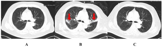 The CT of the chest during the patient’s hospital stay. (A): the Chest CT on 8 February (two days before surgery); (B): the Chest CT on 4 March (day 22); (C): the Chest CT on 22 April (day 71). The areas indicated by the red arrows are the sites of infection.