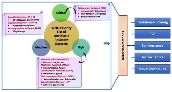 It also draws attention to highly perilous gram-negative bacteria, including Acinetobacter, the Enterobacteriaceae family, and Carbapenemases, as they are resistant to numerous conventional antibiotics compared to other dangerous gram-positive bacteria [,]. Generally, individuals infected with these resistant pathogens do not have any symptoms at the initial stage. Consequently, we found it difficult to stop the outbreaks before isolating the infected individual. Numerous clinical diagnostic and therapeutic methods have been used to identify the prevailing and evolving resistance traits and to adopt potentially life-saving antibiotic therapy []. The resistance of a pathogenic species to specific drugs was assessed using AST measurements. The current gold standards for AST are based on culture-based methods such as broth and agar dilution, rapid β-lactamase disk, and MIC gradient diffusion strip tests, which are generally based on monitoring the growth of bacteria that have formed either inhibition halos in agar plates or turbidity in liquid media, which are widely used [,,,,,]. Pure isolates should be used for culture enrichment, which requires several days. After inoculation of isolates onto agar or broth media, results were obtained in approximately 1–2 days [,,]. However, in most instances, the tools employed are inadequate with protracted and expensive protocols and produce inaccurate results. Hence, preventive action, along with sensible antimicrobial susceptibility testing (AST) procedures, and the careful monitoring of these severe health threats is crucial, which requires continuous research and the discovery of new antibiotics to meet public health needs [].