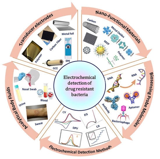 The aforementioned various probe molecules are incorporated with functional nanomaterials using novel strategies to develop the electrochemical sensor modules for the various resistant bacteria detections. In the following section, we will elaborate the significant properties of nanofunctional materials and sensing strategies in distinct pathogen detection.