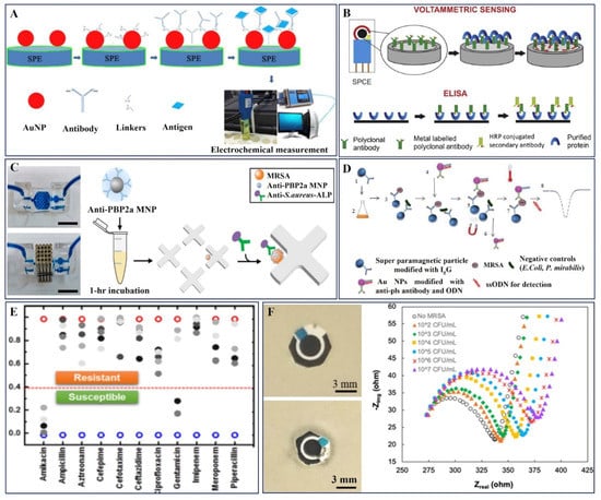 (A) Preparation of AuNP-modified carbon SPEs for the electrochemical detection of MRSA. Copyright (2020) Elsevier []. (B) Schematic representation of the electrochemical sensor using titania nanotubes modified SPCE coated with metal labeled antibodies-based MRSA detection. Copyright (2014) Elsevier []. (C) Photograph of bacterial capture device filled with dye in the absence and presence of an array of external magnets and anti-S. aureus antibodies functionalized with ALP integrated into the device. Copyright (2019) Elsevier []. (D) Scheme of MRSA detection using magnetic separation and electrochemical detection of oligonucleotides. Copyright (2016) Royal Society of Chemistry []. (E) Similarity measures estimated using the pattern matching algorithm for A. baumannii R4197. The dark color indicates a higher concentration. Blue and red circles indicate the similarity measure of cell-free media and A. baumannii R4197 without antibiotics. Copyright (2020) Springer, Nature Publishing Group []. (F) Immobilized phage SATA-8505 infectivity study and Nyquist plot for SATA-8505 modified electrode in the absence and presence of MRSA at different concentrations. Copyright (2021) The Electrochemical Society [].