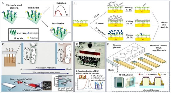 (A) Schematic description of the developed electrochemical sensor platform for simultaneous detection, elimination, and inactivation of S. aureus. Copyright (2017) Elsevier []. (B) Interaction between Screen Printed Gold Electrodes-Van with different bacteria. Copyright (2021) Elsevier []. (C) Stepwise fabrication of L-CeONP/ITO working electrode by CV method for electrochemical analysis of E. coli in presence of antibiotics. Copyright (2020) American Chemical Society []. (D) Mini PCR machine used for DNA amplification and portrayal of the DNA binding process and DNA measurement using the DPV technique. Copyright (2019) Royal Society of Chemistry []. (E) Fabrication of a microbial biosensors platform to monitor the bacterial response to ampicillin. Copyright (2019) Royal Society of Chemistry [].