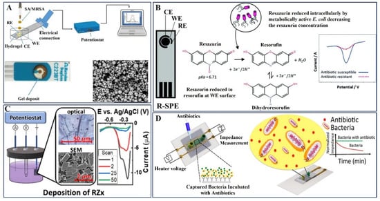 Hannah et al. reported a method to monitor bacterial growth and determine antibiotic susceptibility: drug-resistant S. aureus cultures were deposited onto agarose gel-modified electrodes containing therapeutically significant drugs (Figure 6A). According to these findings, S. aureus can grow on electrodes modified with gel that does not include any antibiotics but is inhibited when the antibiotic is seeded into the electrode modified with gel. In contrast, MRSA drug-resistant strains can grow on electrodes modified with gels that contain clinically significant levels of antibiotics. The results indicate that quick growth profiles with potential antibiotic susceptibility result in less than 45 min, which is a significant improvement over the current gold standards of at least 1–2 days [].