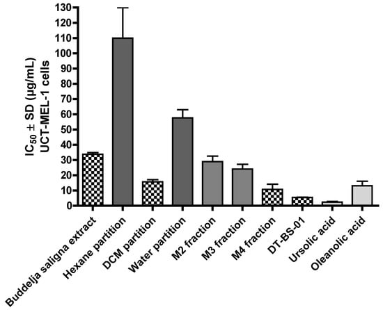 Fifty percent inhibitory concentration (IC50) values of Buddleja saligna ethanolic extract, partitions, major fractions and compounds isolated from B. saligna for a 72 h treatment period against human maligant melanoma cells (UCT-MEL-1) deteremined using XTT.