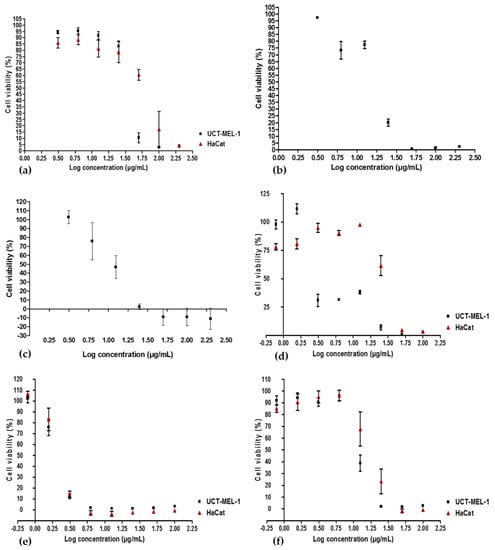 Dose—response curves depicting the antiproliferative activity of (a) Buddleja saligna ethanolic extract, (b) dichloromethane partition, (c) M4 major fraction, (d) DT-BS-01 triterpenoid mixture, (e) ursolic acid and (f) oleanolic acid against human malignant melanoma (UCT-MEL-1) cells and human keratinocytes (HaCat). Data shown are mean ± SEM (n = 3).