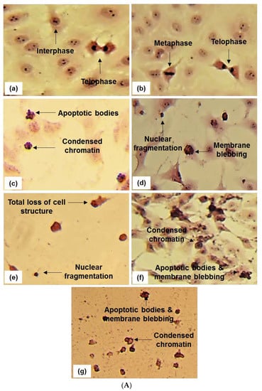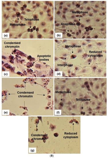 In (A) Hematoxylin and eosin staining (20 and 40× magnification) of UCT-MEL-1 cells after 48 h exposure to; (a) media (untreated) control, (b) 0.25% DMSO (vehicle) control, (c) 0.025 µg/mL actinomycin D (Act D) positive control, (d,e) Buddleja saligna extract (30 and 60 µg/mL) and (f,g) isolated triterpenoid mixture DT-BS-01 (5 and 20 µg/mL). Data are representative of one of two similar experiments. In (B) Hematoxylin and eosin staining (20 and 40× magnification) of HaCat cells after 48 h exposure to; (a) media (untreated) control, (b) 0.25% DMSO (vehicle) control, (c) 0.025 µg/mL actinomycin D (Act D) positive control, (d,e) Buddleja saligna extract (30 and 60 µg/mL) and (f,g) isolated triterpenoid mixture DT-BS-01 (5 and 20 µg/mL). Data are representative of one of two similar experiments.