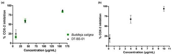 Dose—response curves of (a) Buddleja saligna (10, 40 and 160 µg/mL) and DT-BS-01 (10, 40 and 160 µg/mL) on COX-2 mediated PGE2 production compared to the positive control, (b) Ibuprofen (0.2, 4 and 10 µM). Data shown are mean ± SD (n = 3).