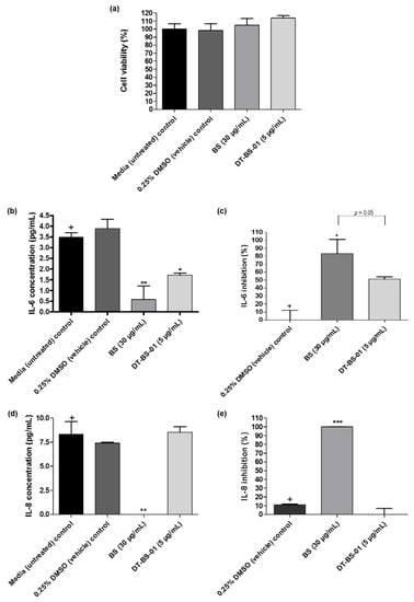 Cell viability was evaluated to ascertain that inhibition of cytokine production was not due to cell death. When the viability of cells treated with the samples was compared to that of untreated cells, no statistical difference (p > 0.05) was observed (Figure 6a). No production of IL-1β, IL-10, IL-12p70 and TNF-α was detected in the PHA stimulated UCT-MEL-1 cells. However, IL-6 and IL-8 were produced. The difference in IL-8 and IL-6 production between the DMSO vehicle control and untreated control (growth media alone), was not significant (p > 0.05), suggesting that DMSO had no effect on IL-8 or IL-6 production in UCT-MEL-1 cells (Figure 6b,d). Both BS (p < 0.01) and DT-BS-01 (p < 0.05) significantly decreased IL-6 production (Figure 6b) by 83.26 ± 17.60 (p < 0.05) and 51.07 ± 2.83% (p > 0.05), respectively. However, inhibition by BS and DT-BS-01 compared to each other showed no significant difference (p > 0.05), suggesting that DT-BS-01 had a similar effect on IL-6 production as BS (Figure 6c). BS significantly decreased IL-8 production (p < 0.01) when compared to untreated cells, while DT-BS-01 had no effect (p > 0.05) (Figure 6d). When compared to the DMSO vehicle control, a percentage inhibition of 100 ± 0.2 (p < 0.001) and 0 ± 6.7% (p > 0.05) was observed for BS and DT-BS-01, respectively (Figure 6e).