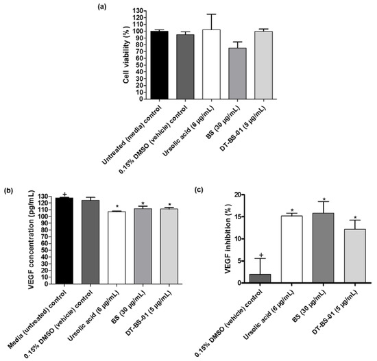 Quantification of VEGF in HaCat cells after treatment with BS (30 µg/mL) and DT-BS-01 (5 µg/mL) for 6 h. Controls included the positive control, ursolic acid (6 µg/mL), DMSO (0.15%) vehicle control and cells grown in medium (untreated). (a) Percentage cell viability, (b) vascular endothelial growth factor (VEGF) concentration (pg/mL) and (c) percentage VEGF inhibition. Data was expressed as mean ± SEM (n = 3). * p < 0.05 indicates statistical significance when compared to the control (+). Statistical analysis was done using one-way ANOVA followed by Dunnett’s Multiple Comparison Test.