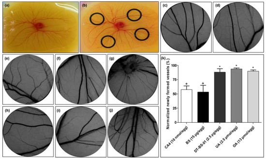 The ex ovo YSM assay was used to determine the effect of BS and DT-BS-01 on angiogenesis using an in vivo model (Figure 8). BS at a concentration of 15 µg/egg was able to decrease the number of newly formed microvessels, with 53.34 ± 11.64% newly formed vessels, which was statistically similar to the positive control, combretastatin A-4 (CA4) at a concentration of 10 nM/egg, which showed 57.49 ± 6.48% newly formed vessels (Figure 8k). In a previous study, CA4 reduced blood vessels in a choriollantoic membrane (CAM) model by 26.8, 47.2 and 77.3% at 1, 5 and 10 nM/egg, respectively, through attenuation of the VEGF/VEGFR-2 pathway [34]. DT-BS-01 (at 2.5 µg/egg), UA (at 2.5 µM/egg) and OA (at 13 µM/egg), were statistically different (p < 0.05) compared to CA4 with 88.20 ± 5.79, 93.78 ± 1.71 and 89.89 ± 2.1% newly formed vessels, respectively (Figure 8k), suggesting that DT-BS-01, UA and OA did not inhibit angiogenesis at the tested concentrations.