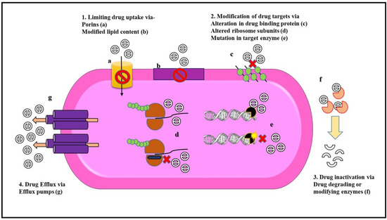 Mechanisms of antibiotic resistance in Gram-negative bacteria. Gram-negative bacteria exhibit different modes of resistance to overcome the action of antibiotics either due to chromosomal mutation or by the acquisition of mobile genetic elements. Some of these resistance mechanisms include (1) Limiting drug uptake with the help of (a) porins channel that prevents the entry of drug molecule and (b) modification of membrane lipid content that acts as a barrier toward the penetration of antibiotics. (2) Modification of drug targets either by (c) alteration in the drug-binding proteins (e.g., penicillin-binding proteins), or (d) altering the target ribosomal subunits (e.g., alteration in the domain V region in the 50S ribosomal subunit leads to linezolid resistance) or (e) by a mutation in target enzyme (e.g., mutation of DNA gyrase in fluoroquinolone resistance) which leads to a decrease in the binding affinity of the antibiotic to the target sites. (3) Drug inactivation can be either due to (f) the production of drug-degrading enzymes such as beta-lactamases or by drug modification via drug-modifying enzymes that conduct biochemical reactions like acetylation phosphorylation and adenylation. (4) Drug efflux is exhibited by (g) overexpression of efflux pumps that carry out extrusion of antibiotics from the bacterial cell (e.g., AcrAB-TolC in Enterobacteriaceae) [58].