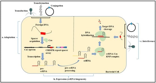 - Expression—This step involves the biogenesis of the CRISPR RNA (crRNA) by the transcription of the CRISPR locus containing the spacer sequence. This process occurs when the bacterial cell is re-infected with the same phage or foreign DNA. First, the primary CRISPR transcript called the pre-crRNA is generated. These transcripts are further processed by different proteins such as Cas5, Cas6, or RNase III depending on the type of CRISPR system (I, II, III) involved. Modification of the pre-crRNA process gives rise to a mature crRNA that contains spacer sequences flanked by partial repeats [98,99].