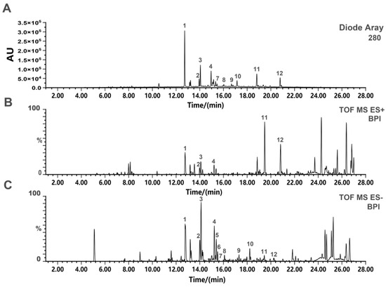 UPLC-Q-TOF-MS analysis of SD-BFRE. (A) The basic peak intensity (BPI) chromatograms of SD-BFRE from UPLC-QTOF-MS analysis in the ultraviolet mode. (B) Chromatograms in the positive ion mode of SD-BFRE. (C) Chromatograms in the negative ion mode of SD-BFRE.