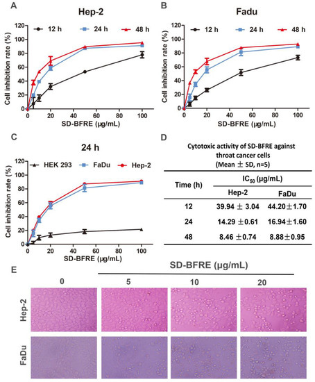 Hep-2, FaDu and HEK 293 cells were plated in 1 × 104 cells/well in 96-well plates and cultured until about 80% confluence. Next, cells were treated with five different concentration gradients of SD-BFRE, then respectively incubated for 12, 24 and 48 h. After processing, the medium was removed. Subsequently, 100 μL mixed reagents (10% MTT and 90% DMEM) were added to each well, then it was put in an incubator of 37 °C constant temperature. After 45–80 min, we added 150 μL DMSO to each well. Under the detection wavelength (562 nm), the absorbance was detected by a microplate reader (Bio-Rad, Hercules, CA, USA). The equation for calculating the inhibition rate was as follows:
