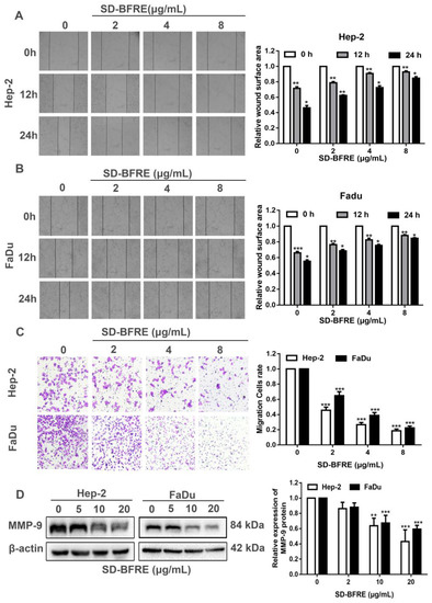 Effects of SD-BFRE on cell migration. (A,B) Micrographs of Hep-2 and FaDu cells after respective incubation with SD-BFRE (0, 2, 4 and 8 μg/mL), and the wound surface area was counted by Image J software. (C) TC cells were seeded in Transwell chambers treated with SD-BFRE. The invading cells were calculated by a fluorescence microscope at the magnification of 200×. (D) Effect of SD-BFRE on MMP-9 protein was performed by Western blot assay. β-actin was served as an internal reference (* p < 0.05, ** p < 0.01 or *** p < 0.001, compare to 0 μg/mL).