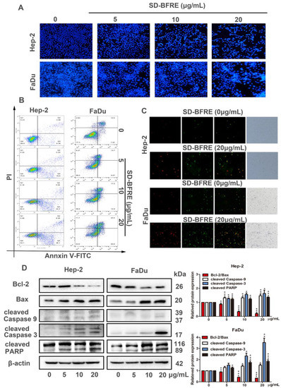 To explore whether SD-BFRE inhibited cell viability was correlated with an increase in apoptosis, Hoechst 33258 staining was served to observe apoptosis in the TC cells. After staining, we can intuitively observe some characteristics of apoptotic cells, such as brilliant blue apoptotic bodies, appeared and the chromatin in the nucleus was condensed. With the increase in SD-BFRE concentration, cells exhibiting these features positively increased (Figure 4A). The flow cytometry combined with a fluorescence microscope were applied to visualize the results of Annexin V-FITC/PI double staining assay. After 24 h incubation with 0, 5, 10 and 20 μg/mL SD-BFRE, the percentages of apoptotic cells (Q2 + Q3) were, respectively, 9.98%, 23.80%, 39.78% and 45.46% in Hep-2 cells and 20.12%, 22.77%, 32.10% and 43.60% in FaDu cells. The result indicated that SD-BFRE dose-dependently induced throat carcinoma cells apoptosis (Figure 4B). Meanwhile, under a fluorescence microscope, the membranes of the viable apoptotic cells were stained with Annexin V-FITC, showing a green fluorescence, and the nucleus of the late apoptotic cells was stained with propidium iodide (PI), producing a red fluorescence. Microscopic observation results directly indicated that SD-BFRE remarkably increased the quantity of apoptotic cells (Figure 4C).