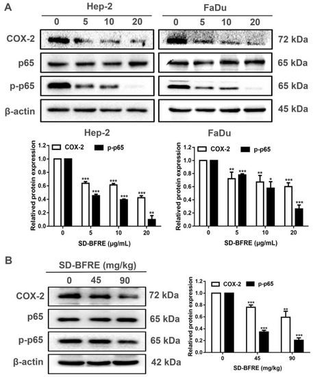 The latest research has indicated that a high expression of Cyclooxygenase-2 (COX-2) is correlated with cell growth and migration of tumor cells [23]. Moreover, the expression of COX-2 was specifically regulated by several transcription factors, including nuclear factor-κB (NF-κB) [24]. The phosphorylation of NF-κB proteins was regarded as an optimal induction of NF-κB target genes, such as p65. To further explore the influence of SD-BFRE on the COX-2/NF-κB signaling pathway, the correlated protein levels were quantified by Western blotting. In vitro, we firstly examined the expression of COX-2, NF-κB p65 and p-NF-κB p65 in two throat carcinoma cell lines, including Hep-2 and FaDu cells. Treatment with SD-BFRE significantly inhibited the protein level of COX-2 and p-NF-κB p65 in Hep-2 and FaDu cells dose-dependently (Figure 6A). In vivo, it was found that the related proteins’ expression trends were consistent with the consequence obtained in vitro (Figure 6A,B). The results suggested that SD-BFRE could attenuate the transcription of NF-κB p-p65 dimer and then suppress the expression of COX-2 in vitro and in vivo.