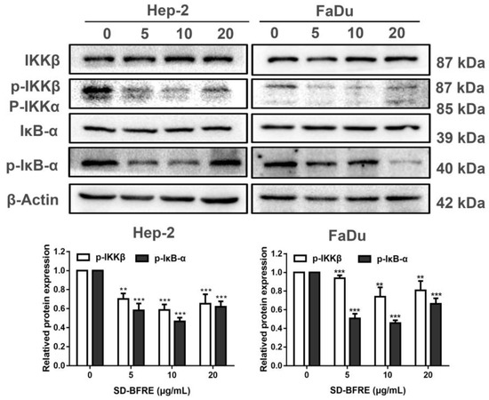 The NF-κB signaling pathway is closely associated with the pathogenesis of inflammation and plays a crucial part in the progression of tumors [25]. NF-κB binds to the inhibitors’ IκB proteins in their resting state and remains inactive in the cytoplasm. Just-activated NF-κB are qualified to translocate to the nucleus and are further involved in gene transcription, nevertheless, the IKK complex is needed for the stimulation of NF-κB [26]. IκB-α is a crucial protein kinase in the canonical NF-κB signaling pathway, and its phosphorylation was majorly regulated by IKKβ. Thus, we investigated the potential mechanisms and evaluated the effect of SD-BFRE on IKK activity in vitro. As shown in Figure 7A, after treatment with SD-BFRE, the proteins’ levels of p-IκB-α and p-IKKβ were gradually decreased in Hep-2 and FaDu cells, while they barely had an impact on the overall protein levels of IKKβ and IκB-α. Therefore, IKKβ kinase might be partly responsible for the inhibition of NF-κB protein activity.