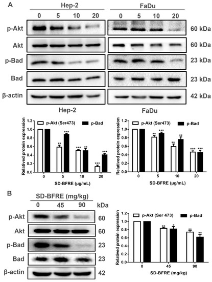 Akt (protein kinase B, PKB) is a common target for anti-tumor treatment, which is known as a downstream target protein of PI3K. Research has demonstrated that the activation of Akt is engaged in a variety of signaling pathways [37], including inhibiting the activation of NF-κB and the cell apoptosis [27,38]. PI3K specifically regulates the activity of Akt by promoting the phosphorylation, so the decrease in phosphorylated Akt (p-Akt Ser473) expression is a significant indicator of the activation of the PI3K/Akt pathway. Activated Akt can phosphorylate a variety of substrates, thereby attenuating pro-apoptotic proteins (such as Bad). The results, both in vitro and in vivo, confirmed SD-BFRE-induced apoptosis in throat carcer cells by inhibiting the PI3K/Akt/Bad signaling pathway (Figure 8).