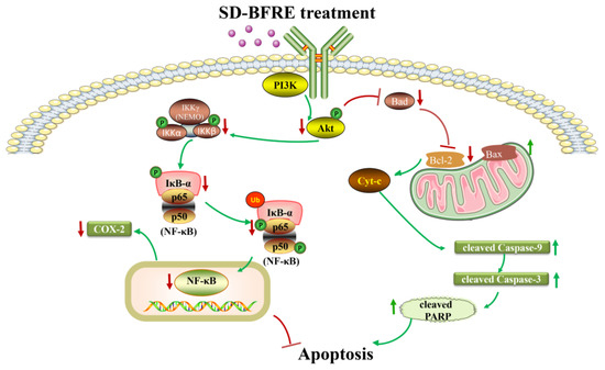 Taken together, SD-BFRE can effectively inhibit throat carcinoma cell proliferation and induce apoptosis by negatively regulating the NF-κB/COX-2 and the Akt/Bad/caspase cascade signaling pathways. Moreover, SD-BFRE suppressed IKKβ and IκB-α kinase activity, hence inhibiting the NF-κB proteins entering the nucleus and interrupting NF-κB binding on the COX-2 promoter, thereby reducing the expression of NF-κB and COX-2 in throat cancer cells. In addition, the phosphorylation of intracellular Akt/Bad signals was down-regulated (Figure 9). These findings provide a possible anticancer mechanism for SD-BFRE treatment. SD-BFRE thus represents a potential chemotherapeutic agent for throat carcinoma.