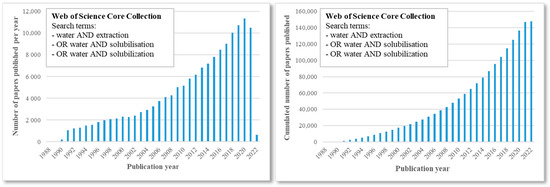 Search results depicting the total number of publications published per year (left) and the cumulated number by year (right) related to solubilisation and/or extraction using water as a solvent. Database: Web of Science Core Collection, time range: 1985–2022.