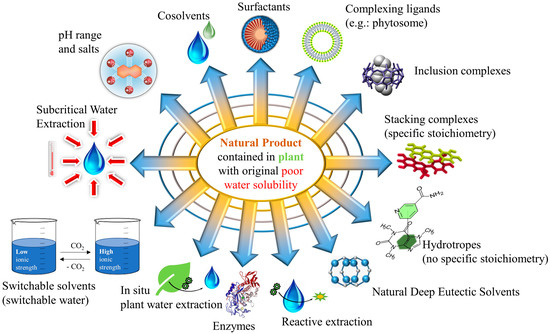 Nevertheless, when water is used to solubilise or to extract natural products (NPs) from actual biological resources, this solvent appears to be relatively inefficient. For instance, the flavonoid rutin—which is theoretically quite polar according to its partition coefficient (Kow ≈ −0.47) [6]—is only sparingly soluble in water (S ≈ 130–150 mg/L) [6,7]. To overcome such a low efficiency in solubilising or extracting NPs, researchers have developed different methods to enhance the water solvent potential while taking advantage of its green qualities. By the turn of the millennium, Yalkowsky [8] had summed up the main methods to enhance the water solvent potential primarily in order to solubilise drugs more efficiently. These methods consist of the following: pH range and salts, cosolvents, surfactants, complexing ligands, inclusion complexes, stacking complexes and hydrotropes.