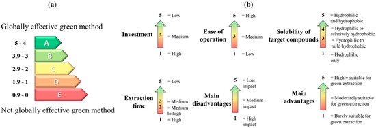 According to this analysis, hydrotropes and NADES are the most globally efficient methods to enhance the solvent potential of water (grade A). The use of hydrotropes is quite easy, very low-cost, and fast, which makes it a cost-effective method to implement globally. As for NADES, their naturality, low cost and ease of dissolubility in water explain their top grade. Nine other methods were given an average grade of B. Finally, the use of enzymes and SWE was given the worst grade (C). In the case of SWE, this grade is attributed to the extremely high investment costs (mainly in the industry) as well as the partial thermal degradation of the target NPs and other products. With regard to the use of enzymes, the difficulty of operation and high extraction time resulted in this C grade. Although both these methods remain relevant to tune water solvent potential, they should be thoroughly studied and optimised for the desired applications. Of course, whilst this overall result could help the reader in choosing the appropriate method, important adjustments and the compliance of the method with target NPs are fundamental criteria to maximise extraction yields.