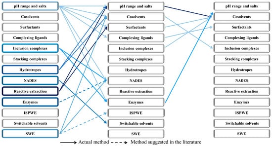 Combinations of methods are useful for two main reasons. Firstly, combinations can lead to an increase in the solubility and extractability of the target NPs. Secondly, combinations can also reduce the intrinsic toxicity of a chemical agent used in a single method, by reducing its concentration. Some agents from one method may be combined with another agent from the same method, which is the case for pH range and salts, cosolvents, surfactants, inclusion complexes, stacking complexes and hydrotropes. Other chemicals are particularly well suited for combining with another method, as is the case with pH range and salts, inclusion complexes, stacking complexes and hydrotropes [8]. In Figure 4, we report useful examples of combinations found in the literature to reach outstanding extraction yields.