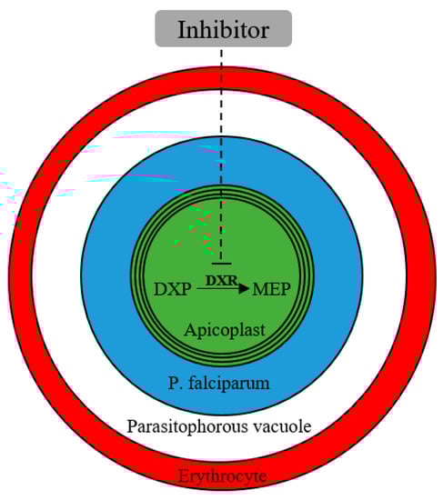 In vitro and in vivo, the Pf parasites infect human erythrocytes for asexual reproduction. Besides the erythrocyte membrane, the parasitophorous vacuole membrane (PVM) and the plasmodium cell membrane must also be overcome. Inside the Plasmodium parasite, DXR is localized in the apicoplast which contains additional four membrane layers (Figure 3) [36].