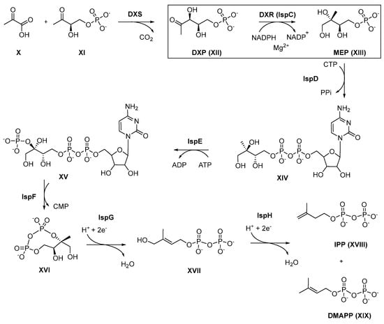 The MEP pathway begins with the synthesis of 1-deoxy-D-xylulose 5-phosphate (DXP) from two glycolytic intermediates, pyruvate (X) and glyceraldehyde 3-phosphate (XI) catalyzed by DXP synthase (DXS), concluding with the production of IPP and DMAPP after six catalytic steps (Figure 4) [79].