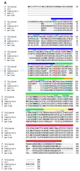 1-Deoxy-D-xylulose 5-phosphate reductoisomerase (DXR) is present in more than 400-annotated (Swiss-Prot) entries in the Uniprot database. These entries consist primarily of bacteria with some examples of eucaryota. The length of the amino acid (aa) sequence varies from 356 aa in Campylobacter jejuni to 488 in Plasmodium falciparum (Figure 6A) [88]. Presently, the DXR structures of E. coli (EcDXR), P. falciparum (PfDXR), and M. tuberculosis (MtDXR) have been more thoroughly characterized and studied [89,90].