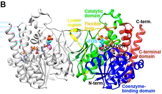 (A): Amino acid sequence alignment of bacterial and parasitic DXRs. Residues involved in phosphate/phosphonate-, linker-, and metal and hydroxamate-binding are highlighted in blue, green, and red, respectively. The colored ribbons above the sequence alignment represent the respective domains in PfDXR: the NADPH-binding (blue), catalytic (green), and C-terminal (red) domains. The linker region and flexible loop in the catalytic domain are colored yellow and orange, respectively. The pink bars and cyan arrows represent the secondary structure elements, namely, α-helices and β-strands, respectively; (B): The overall structure of the quaternary (enzyme-NADPH-metal-inhibitor) complex of PfDXR (PDB 3AU9) [91]. Three domains, a linker region, and a flexible loop in the catalytic domain of one subunit are colored as in (A). The other subunit is colored grey. The bound fosmidomycin (FOS) and NADPH molecules are shown as ball-and-stick (cyan) and stick (grey) models, respectively. The bound magnesium ions are shown as sphere models (pink).