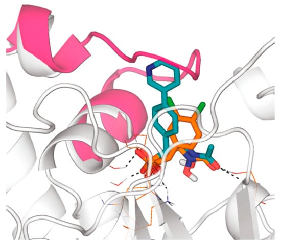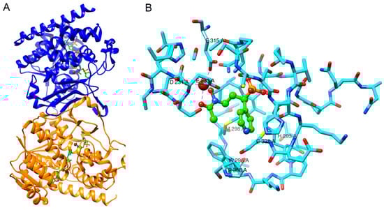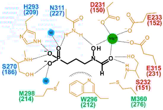 The substrate-binding cavity of DXR is highly conserved in all organisms and consists mainly of three regions: a positively charged phosphate/phosphonate binding pocket, a hydrophobic region around the linker backbone, and a metal binding pocket [31,32]. Note that the residues involved in inhibitor binding described below are conserved among DXRs (Figure 6A). The substrate and substrate-analogous inhibitors bind to the cleft of the catalytic domain and induce a conformational change that tether the N-terminal and the catalytic domains in the closed conformation. Concomitantly with the movement of the catalytic domain, the C-terminal domain also shows a closed conformation. In addition, the flexible loop (residues 291–299 in PfDXR, colored orange in Figure 6) in the catalytic domain adopts a conformation that allows it to function as a lid over the active site. The highly conserved residues Trp296 (212), Met298 (214), and Met360 (276) form a barrier between the active site and the solvent. The indole ring of Trp296 (212) provides the key hydrophobic interaction with the alkyl chain of the substrate and the backbone of fosmidomycin, which lies parallel within a distance of 4 Å. The acidic residues Asp231 (150), Glu233 (152), and Glu315 (231) are conserved at the active site and coordinate the divalent metal cation essential for enzyme activity. Met298 (214), Met360 (276), and the nicotinamide ring of NADPH also contribute to the formation of the hydrophobic binding pocket. The phosphonic acid moiety of fosmidomycin is bound similarly to the phosphate group of DXP in EcDXR, forming hydrogen bonds with Ser270 (186) and Asn311 (227). The phosphonate group also forms a hydrogen bond with His293 (209). The hydroxamic acid moiety of fosmidomycin coordinates the divalent metal cation that is bound by the side chains of Asp231 (150), Glu233 (152), and Glu315 (231). The hydroxamate group also interacts with Ser232 (151) and Asn311 (227) (Figure 7).