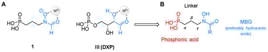 (A) Binding of 1 and natural substrate DXP (III) to a metal ion, represented by a grey sphere. (B) Simplified pharmacophore model of fosmidomycin-based DXR inhibitors MGB: Metal-binding group.