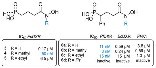 In parallel, reverse fosmidomycin analogs with a phenyl substituent in the α-position of the propyl linker were reported by Kurz and co-workers (6a–d, Figure 9). α-Phenyl analog (6a) served as a lead compound for the reverse inhibitor type. Furthermore, the compounds were decorated with small alkyl substituents (Me, Et, iPr) at the hydroxamic acid nitrogen. The N-methylated carba analog 6b was the most active inhibitor in the first reverse series, outperforming fosmidomycin and FR900098 in EcDXR and PfDXR inhibition with IC50 values of 0.24 μM and 3 nM, respectively. Enzyme inhibition data demonstrated that the strength of EcDXR and PfDXR inhibition decreased as the size of the substituent on the hydroxamic acid nitrogen increased. While the N-methyl-substituted DXR inhibitor 6b is a potent Pf growth inhibitor, the N-ethyl substituted derivative 6c already showed a 5-fold reduction in cellular antiplasmodial activity against Pf-K1. The bulkier N-isopropyl group of compound 6d led to a loss of inhibitory activity against the PfDXR and EcDXR enzymes and Pf-K1 [100,101].
