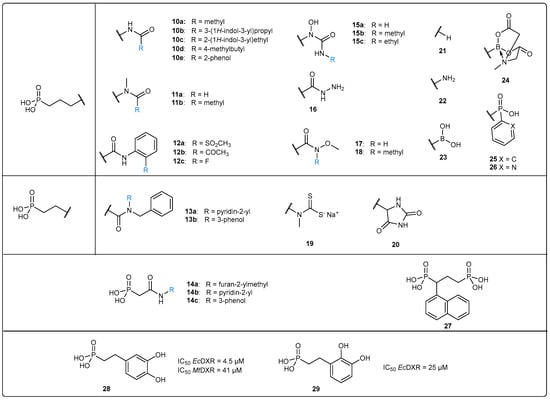 Further work on replacing the hydroxamate MBG with different nitrogen-containing metal chelating moieties such as hydroxyureas (15a–c), hydrazide (16), O-methylated hydroxamate (17, 18), dithiocarbamate (19) or hydantoin (20) functionalities (Figure 11) was performed [109]. For the hydroxyureas (15a–c) results regarding antiplasmodial or antibacterial activity have not been published [109]. Furthermore, the potential metal chelators 16–20 did not display any inhibitory activity towards EcDXR. The authors suggested that the protonation of the hydrazide group of 16 under the assay’s conditions (pH = 7.5) could explain the loss of its chelation capability. In the case of 19, the authors reported decomposition of the dithiocarbamate moiety under the conditions of the enzyme assay [110]. The negligible MtDXR inhibition of 20 is not surprising given that the hydantoin moiety of derivative 20 is not an established MBG [104]. Mercklé et al. showed that, as expected, the removal of the hydroxamic acid MBG as in the propyl phosphonic acid 21 and the aminopropyl phosphonic acid 22 (Figure 11) resulted in a complete loss of activity towards EcDXR [105]. Mancini reported a chemically interesting derivative with a boronic acid unit as a potential MBG (23, Figure 11), though it was inactive in the EcDXR enzyme assay. Prodrug 24 (Figure 11) to boronic acid 23 showed negligible activity towards E. coli [111]. Additionally, phosphinic acids with an aryl (25) or heteroaryl residues (26) were synthesized, but not evaluated against DXR (Figure 11) [112]. Furthermore, the bisphosphonic acid (27) was also inactive against DXR of Ec, Pf and Mt (Figure 11) [93]. The two catechol derivatives with a 3,4-catechol (28) and 2,3-catechol moiety (29) stood in contrast to the previously mentioned inactive derivatives (Figure 11). Compound 28 was at least weakly active against MtDXR (IC50 = 41 µM) but no in vitro growth inhibition of Mt was observed. Interestingly, when tested against EcDXR, the 2,3-catechol derivative 29 (IC50 = 25 μM) was weaker than the 3,4-catechol analog 28 (IC50 = 4.5 μM). These results confirmed the importance of the position of the two catechol hydroxyl groups for sufficient metal coordination [110,113].