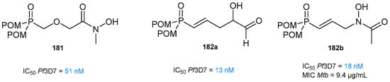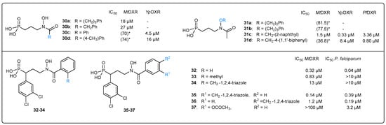 Guided by an MtDXR fosmidomycin co-crystal structure, the Dowd group was the first to develop a series of fosmidomycin analogs aimed to occupy both binding pockets. Two series of compounds, fosmidomycin-like hydroxamic acids with large acyl residues (30a–d, Figure 12) and arylalkoxyamides (31a–d, termed O-linked bisubstrate inhibitors, Figure 12), were synthesized as potential bisubstrate inhibitors. While none of the derivatives was more active than fosmidomycin against MtDXR, compounds 30a and 30b showed at least weak IC50 values of 18 and 27 µM. Docking experiments suggested that compound 30a could interact with MtDXR via an alternative non-bisubstrate mode of binding. So far, the Dowd group concluded that the hydroxamic acids 30a, b are more potent MtDXR inhibitors than the arylalkoxyamide derivatives (31a, b) [41,115]. Later on, compound 30a was tested for its ability to inhibit the PfDXR enzyme, but the compound showed only moderate activity with an IC50 of 1.34 µM [115,116].