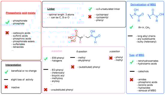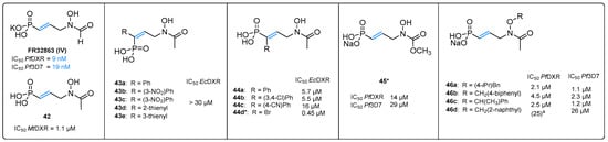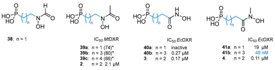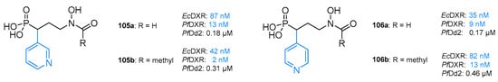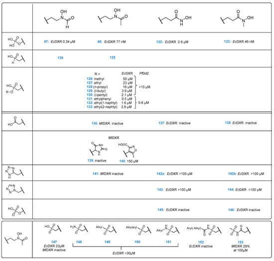 So far, all attempts to replace the hydroxamate group with alternative chelating groups greatly reduced or resulted in a complete loss of inhibitory activity. The above-summarized results illustrate the predominant role of the hydroxamic acid MBG in DXR inhibitors.