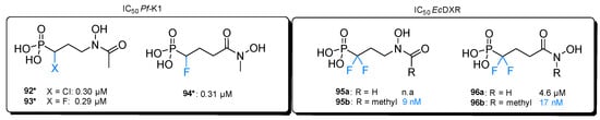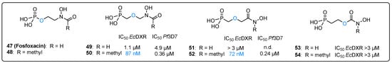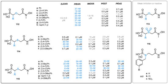 To date, the DXRs of P. falciparum, E. coli and M. tuberculosis (Mt) are the best-studied enzymes. As a result, most synthesized fosmidomycin analogs have been tested against at least one of these enzymes, in addition to cellular assays. Additional information about the efficacies of 1 and 2 against these pathogens can be found in the Supplementary Materials (Table S1).