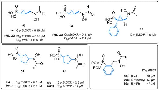 - Devreux, V.; Wiesner, J.; Goeman, J.L.; Van der Eycken, J.; Jomaa, H.; Van Calenbergh, S. Synthesis and Biological Evaluation of Cyclopropyl Analogues of Fosmidomycin as Potent Plasmodium falciparum Growth Inhibitors. J. Med. Chem. 2006, 49, 2656–2660. [Google Scholar] [CrossRef][Green Version]