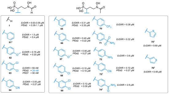 - Jansson, A.M.; Więckowska, A.; Björkelid, C.; Yahiaoui, S.; Sooriyaarachchi, S.; Lindh, M.; Bergfors, T.; Dharavath, S.; Desroses, M.; Suresh, S.; et al. DXR Inhibition by Potent Mono- and Disubstituted Fosmidomycin Analogues. J. Med. Chem. 2013, 56, 6190–6199. [Google Scholar] [CrossRef] [PubMed]