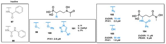 In order to create beneficial hydrophobic interactions in the hydrophobic sub-pockets of Ec and PfDXR, Giessmann et al. [102] and Ortmann et al. [103] replaced the formyl group of fosmidomycin with aliphatic and aromatic acyl residues (7, 8, Figure 10). Within these series, the pentafluoro benzoyl derivative (7c) and the 4-phenoxybutanamide analog (8b) were the most active representatives with IC50 values of 1.3 (7c) and 1.0 µM (8b) against EcDXR [102,103]. Flexible docking studies suggested that the acyl residues of compounds 7a–e prevented the formation of the preferred geometry of the hydroxamate-metal complex [103].