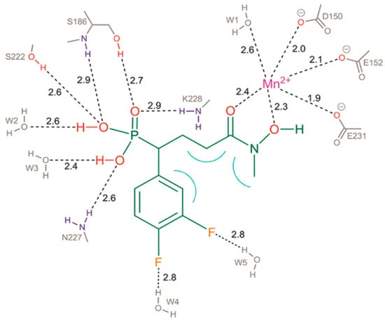 Chemically, fosmidomycin is often described as a retro-hydroxamate. More specifically, with respect to the hydroxamate moiety, fosmidomycin is an N-substituted formohydroxamic acid. Regarding fosmidomycin analogs, the term reverse fosmidomycin derivative is commonly used for analogs, where the carbonyl group of the reversed hydroxamic acid is attached to the propyl linker and not to the nitrogen. The hydroxamic acid (HA) functionality is a common bidentate metal binding group (MBG) capable of chelating metal cations such as Zn2+, Fe2+, Fe3+, Mg2+ and Mn2+ in the active sites of metalloenzymes [96]. The chelation of the catalytically essential metal cation (Mg2+ or Mn2+) in the active site of DXR by the retro-hydroxamate group of fosmidomycin is essential to its anti-infective effects.