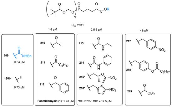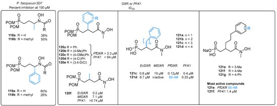 Based on the pharmacophore model defined in the previous section (Figure 8B), modifications of fosmidomycin and FR900098 will be discussed. These structural changes to both lead structures were introduced to overcome their poor pharmacokinetic properties and to especially improve the permeability. To assess structure–activity relationships (SAR), a wide array of structural modifications will be presented as well as their impact on the anti-infective activity. Docking studies and co-crystal structures are included to further illustrate this SAR.